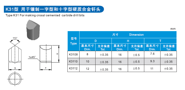 K30、K31型用于鑲制一字型、十字型硬質(zhì)合金釬頭