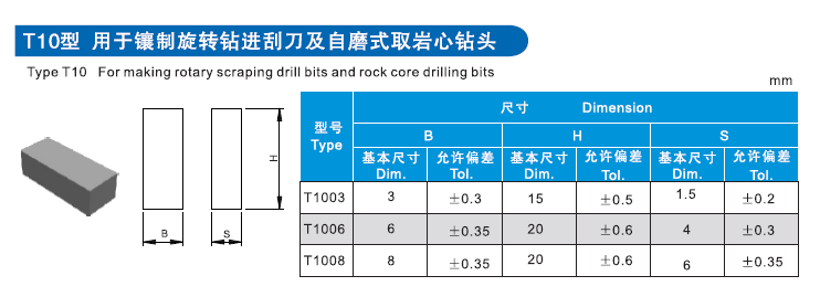 T10型用于鑲制旋轉(zhuǎn)鉆進(jìn)刮刀及自磨取巖心鉆頭